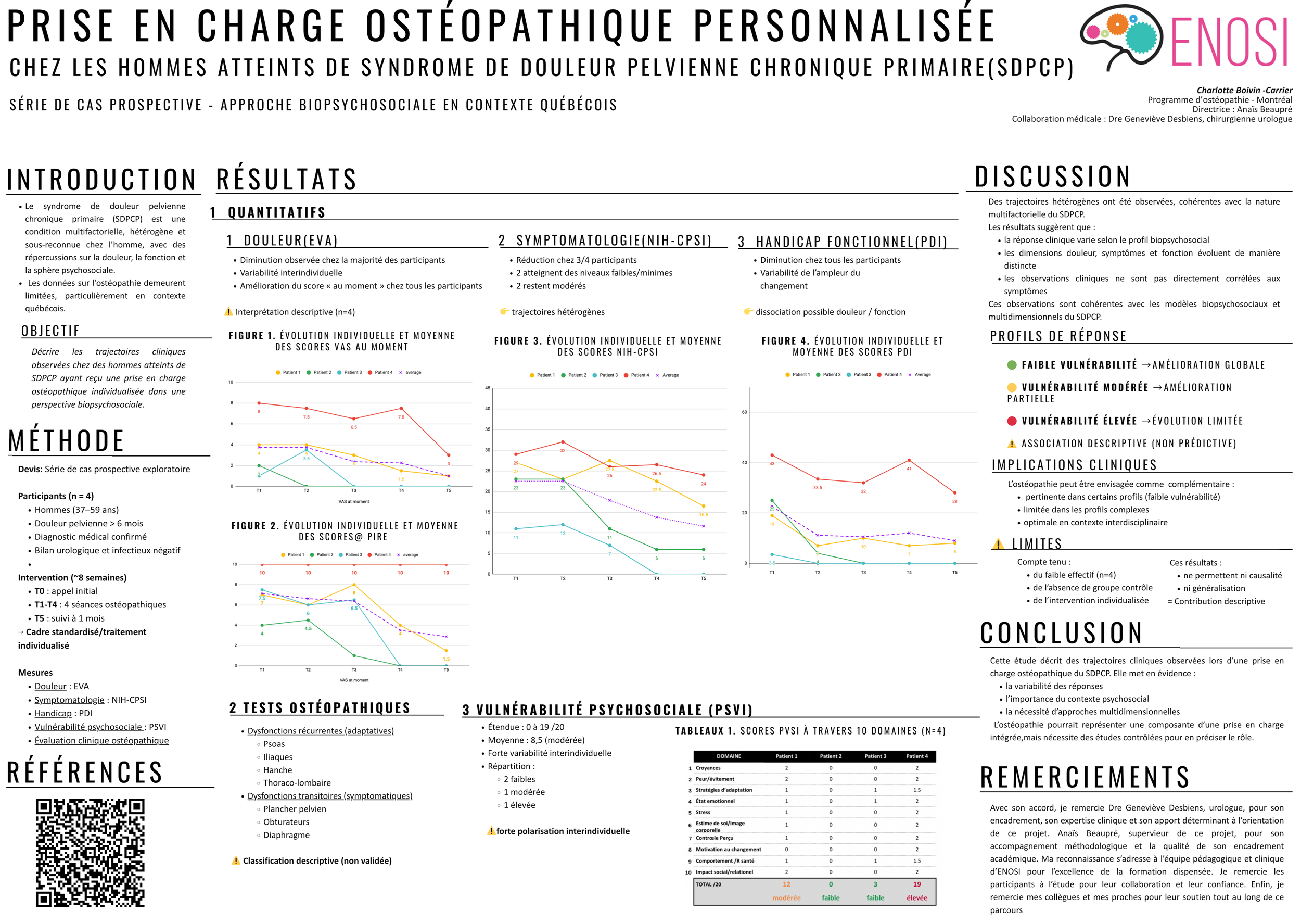 Série de cas prospective incluant quatre participants présentant un diagnostic médical de CPPP. Chaque participant a bénéficié de quatre séances d’ostéopathie individualisée, guidées par une évaluation clinique structurée.